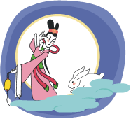 So why is there a rabbit in the picture? Well…. there’s another legend about a rabbit, a fox and a monkey. One day, three poor old men (who were actually fairy sages in disguise) begged the animals to give them some food. The fox and the monkey both had food to give the old men. But the rabbit had no food to give. So he jumped into the fire and sacrificed himself so that the old men could eat. They were so impressed by his kindness that they sent him to live in a Palace on the Moon, where he became the Jade Rabbit! He lives there to this day, grinding herbal medicines for the Immortals with a mortar and pestle.