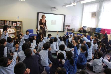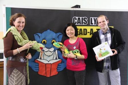 Thank you to all the dedicated staff and happy kids of Prep to Grade 3, CAIS, Kwai Chung campus! I loved my day with you all – you were so enthusiastic and welcoming, and listening to the staff singing and playing the piano so beautifully in the staff room at lunchtime was an unexpected delight! Here’s a photo of me above with the Grade 3s for our Poetry Workshop, and below with lovely librarian Jeannie Li and Justin Enns, my “slave” for the day who turned the pages as I told my Tale of Sybil Snake! Justin is a wonderful artist who drew lion cub Sparkle, mascot of the CAIS Read-a-Thon, on the poster in the picture! You CAIS kids are so lucky to have such gifted and creative teachers!