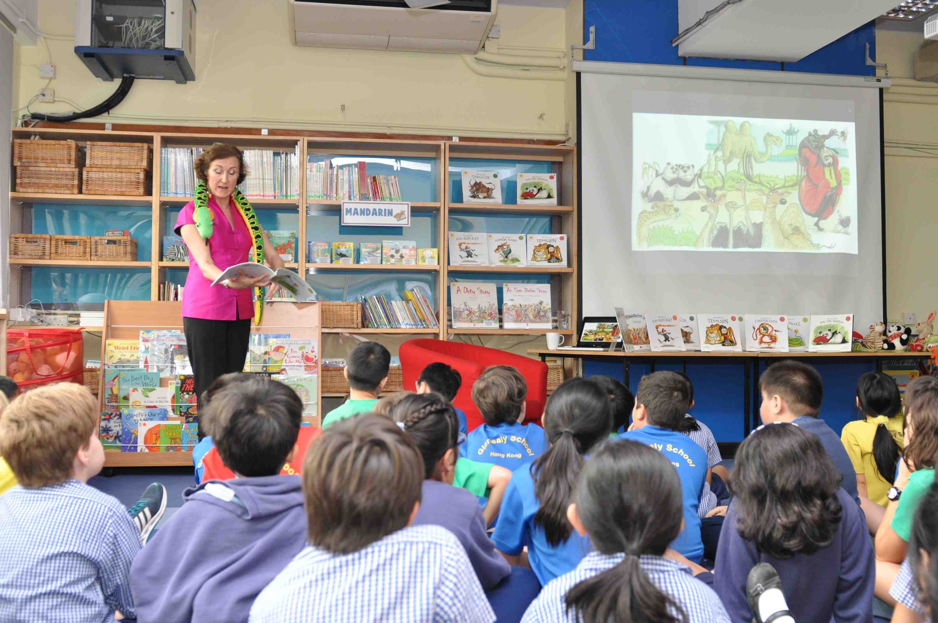 April 18, 2013 at 3:06 pm | Posted in Uncategorized | 2 CommentsWhat a wonderful time I had today at Think International School, a small but very special school in Kowloon Tong! The little ones in Kindy and Grade 1 were fantastic at their Italian “magnifico”s in The Tale of Chester Choi; the Grade 2s and 3s were experts on the Chinese Zodiac animals in The Tale of Pin Yin Panda, and the Grades 4 to 6 were not only very good at sound effects, but also acted very convincingly as ostriches and walking fences when we discussed the Silk Road as part of my Sybil Snake story reading! Huge thanks to Purti Singh, the PYP co-ordinator, for inviting me to the school and looking after me so well during my visit!