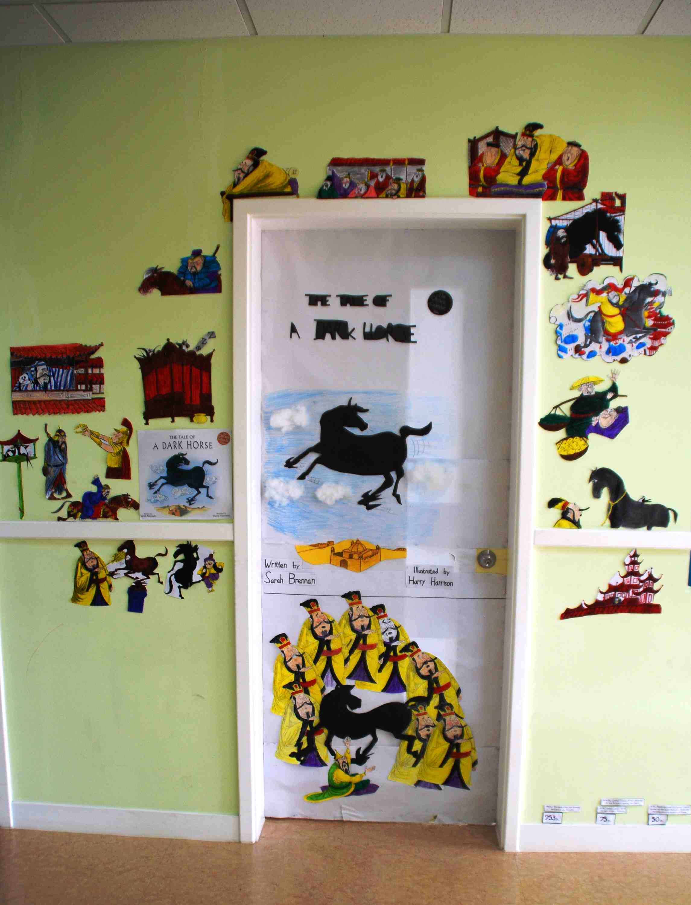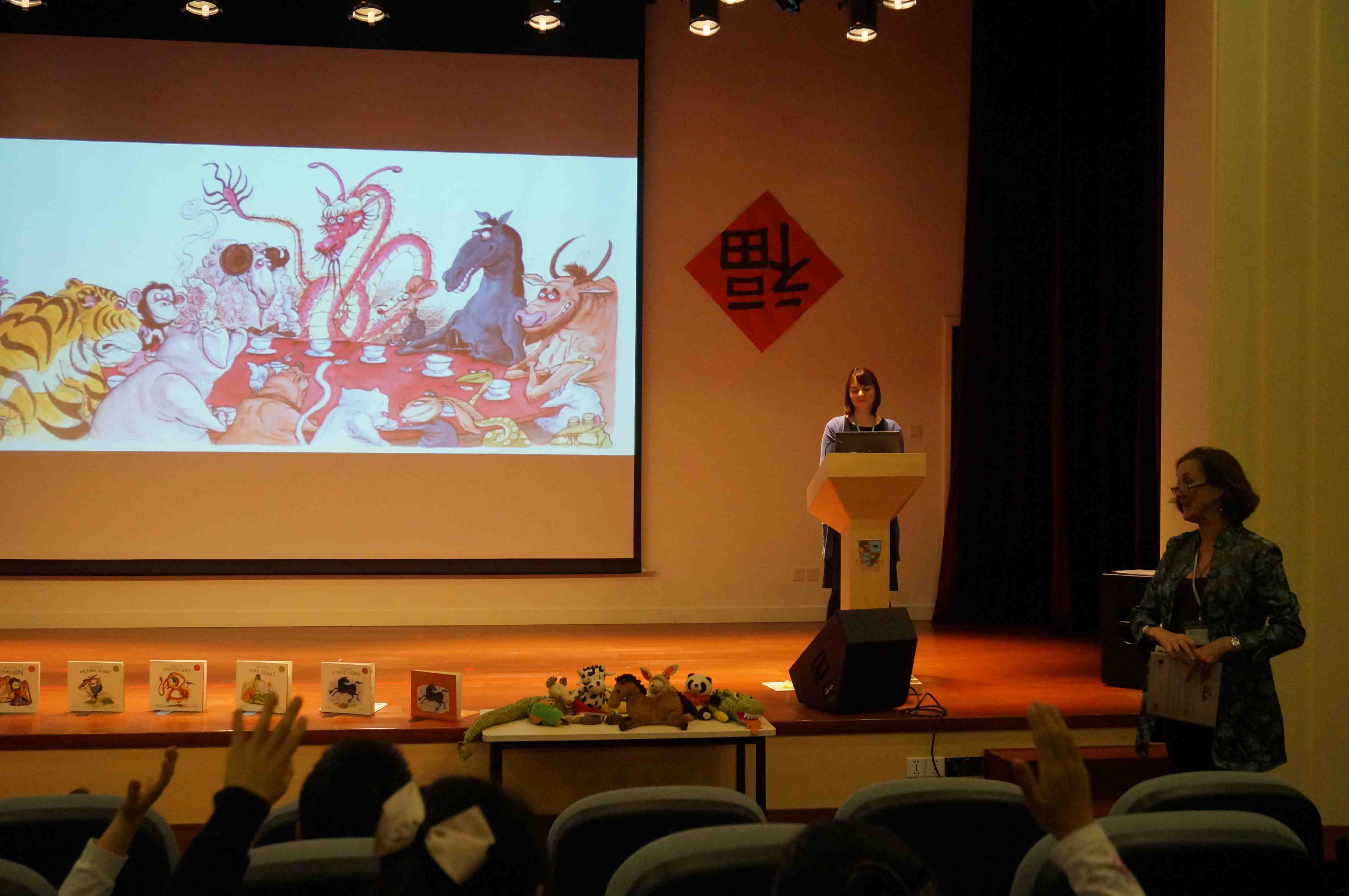 On Tuesday I visited the beautiful new, ultra-modern Britannica International School, where KS3 English teacher Helen Mun, hosted me to a lovely morning of story readings with the kids. Here is a wonderfully Horsey Door to a classroom; then introducing the little kids to Pin Yin Panda and a Chinese New Year’s Feast; and some of my lovely fans!