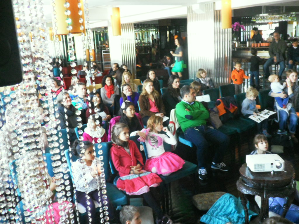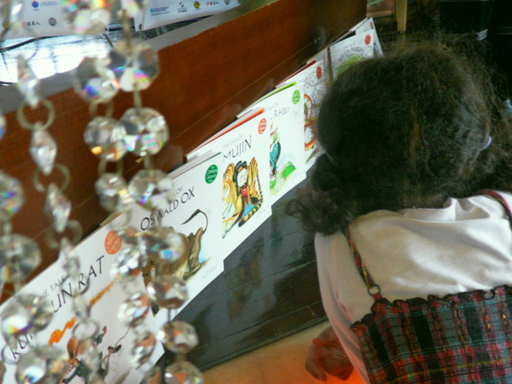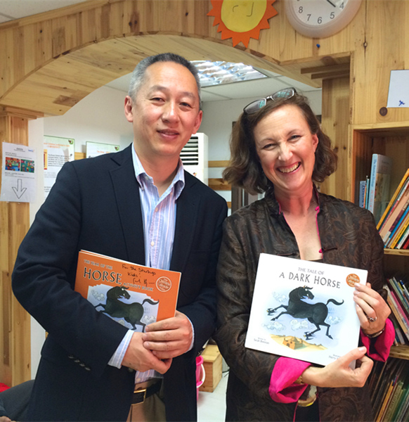 Then on Sunday afternoon I spent a wonderful hour with the kids, mums and dads at Starbugs Academy, a fantastic after-school club for local Shanghai children who are learning English by – you guessed it – reading lots and lots and lots of English language children’s books! It’s such a great idea, and the kids speak fabulous English! Here I am with my friend Qing Yang, founder of the Academy, during a session and with one of my fans afterwards!