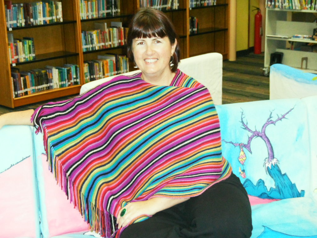 And here I am with the fabulous Kimbra Power, a fellow Tasmanian, and primary librarian at Shanghai American School Pudong which I visited on Wednesday 19th March, and her team, Joji and Stella! Take a look at the wild and wacky Dr Seuss paintings on the sofa, drawn by the upper school artists! Below is Kimbra’s lovely daughter Hannah, and the book display table!
