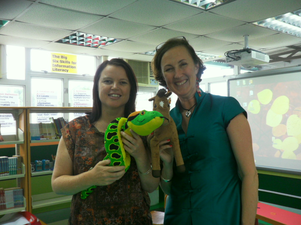 October 9, 2014 at 8:21 pm | Posted in Uncategorized | 2 CommentsA big hello to all the terrific kids of Think International School, where I spent a very happy day today! We had story readings, with Pin Yin Panda meeting the Grade 1s, Temujin the Tiger roaring at the Grade 2s and my noble Dark Horse galloping in to see the Grade 3s and 5s. And then the clever Grade 4s and Grade 7s created a very exciting story plan involving aliens invading Clearwater Bay Beach on a hot summer day 100 years from now, in my Nailing the Narrative Curve Workshop! We had a lot of fun! Thanks so much to Melanie Bates for inviting me and to librarian Leanne Richardson (below) for looking after me so well! And kids – remember to read lots and lots of books – it’s health food for the brain!