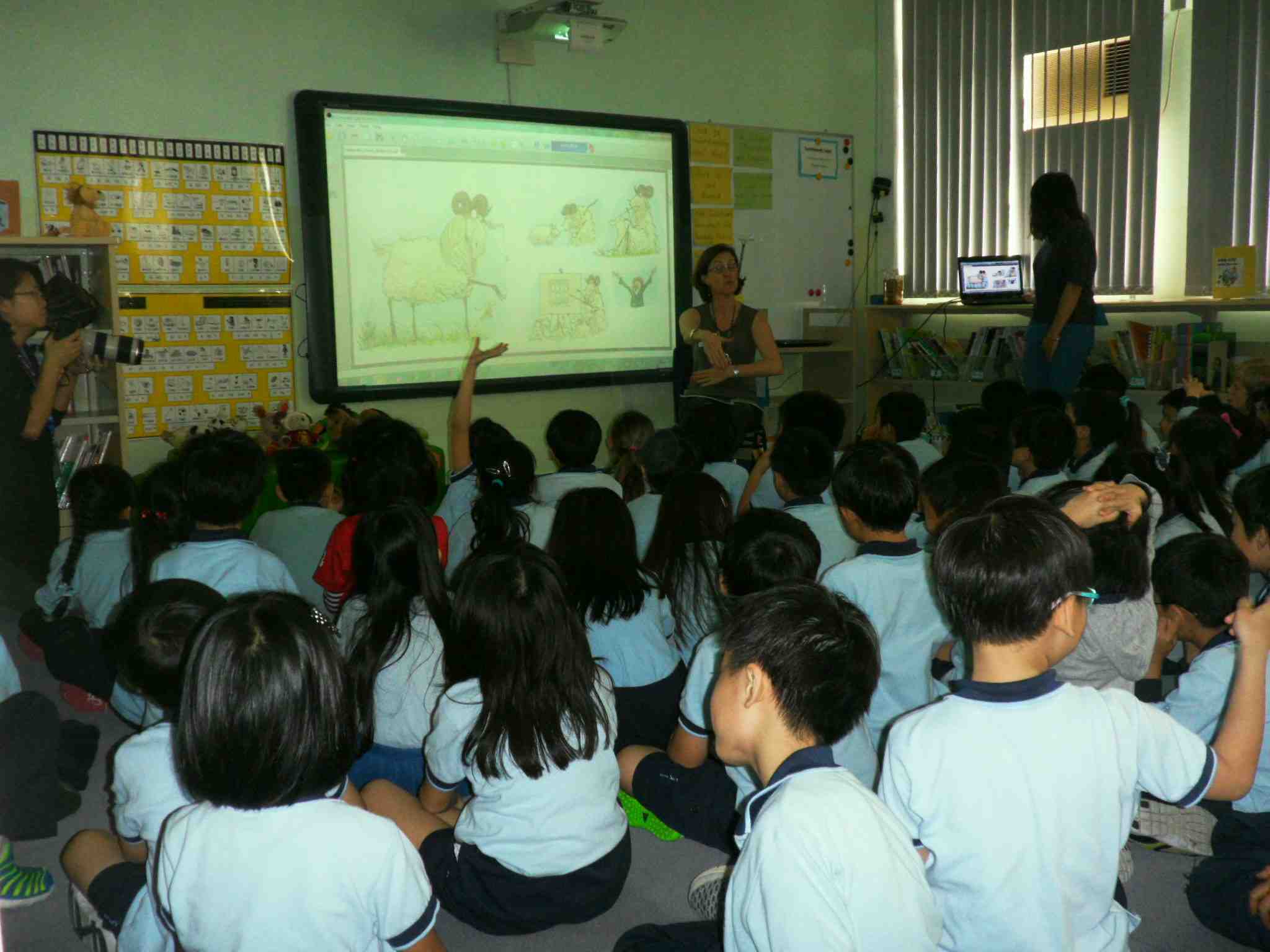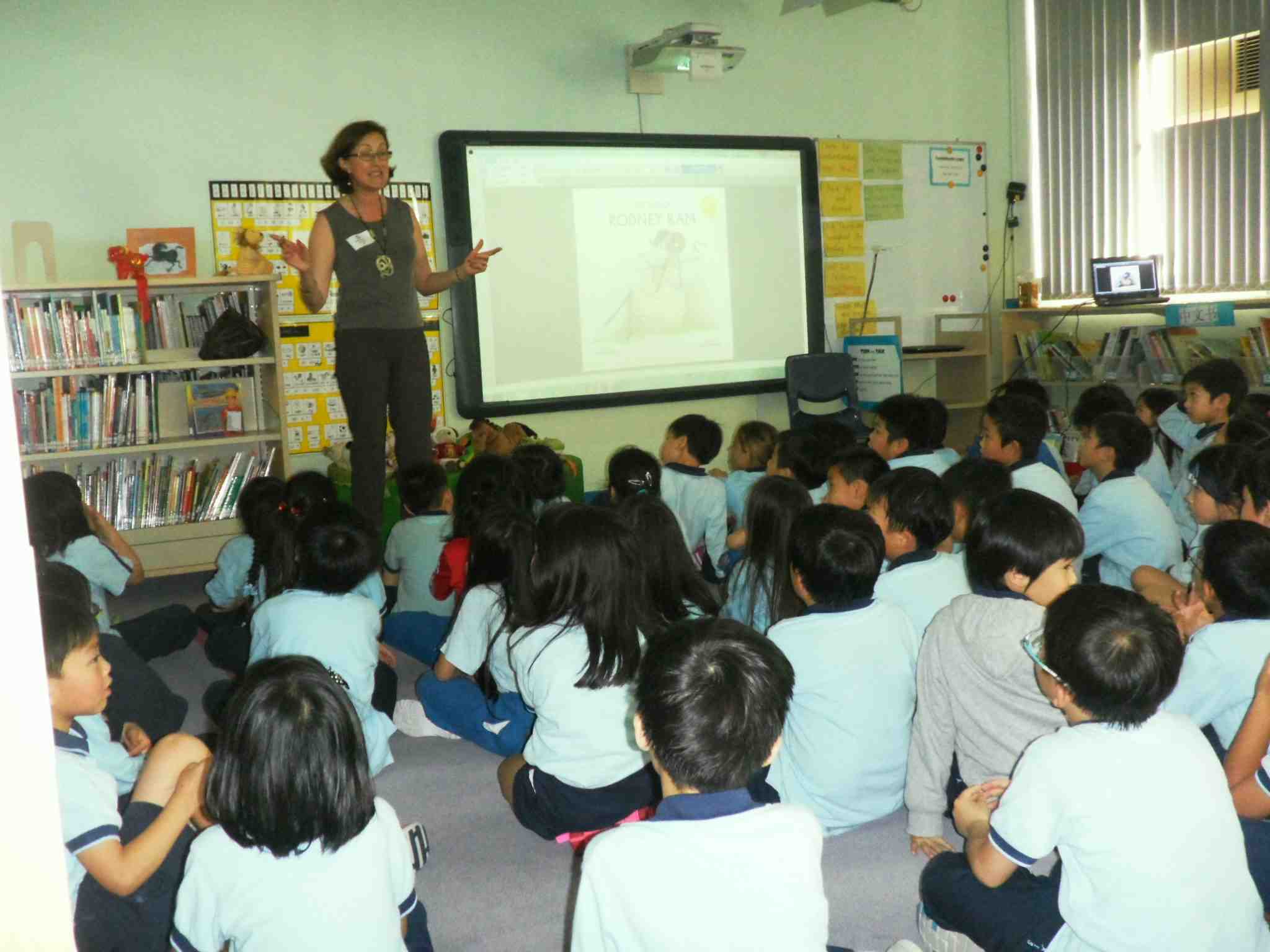 Today my funny and fabulous Chinese Calendar Tale characters and I went romping in to Christian Alliance International School Lower Primary Campus at Kwai Chung! We met the gorgeous Kindies, some Grade 1s, and the Grade 2s, with two story readings of The Tale of Pin Yin Panda, and two of The Tale of Rodney Ram! And they all met my fun cast of stuffed toys, cousins of my Chinese Calendar characters. Here I am above with librarian Jeannie Li, holding Spring the Lamb, library technician Justin Enns looking a bit puzzled as he points at the Big Cat Stamford, who never made it into the Zodiac (all because of that cheating Rat), and me with my Bear Bunny Bear! I’ll be seeing you all again on Monday when I visit the rest of the Grade 1s and the Grade 3s!