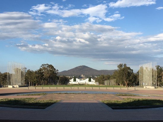 Leave a commentThe view from the new Parliament House, with the old Parliament House in the middle distance and the magnificent War Memorial in the far distance.