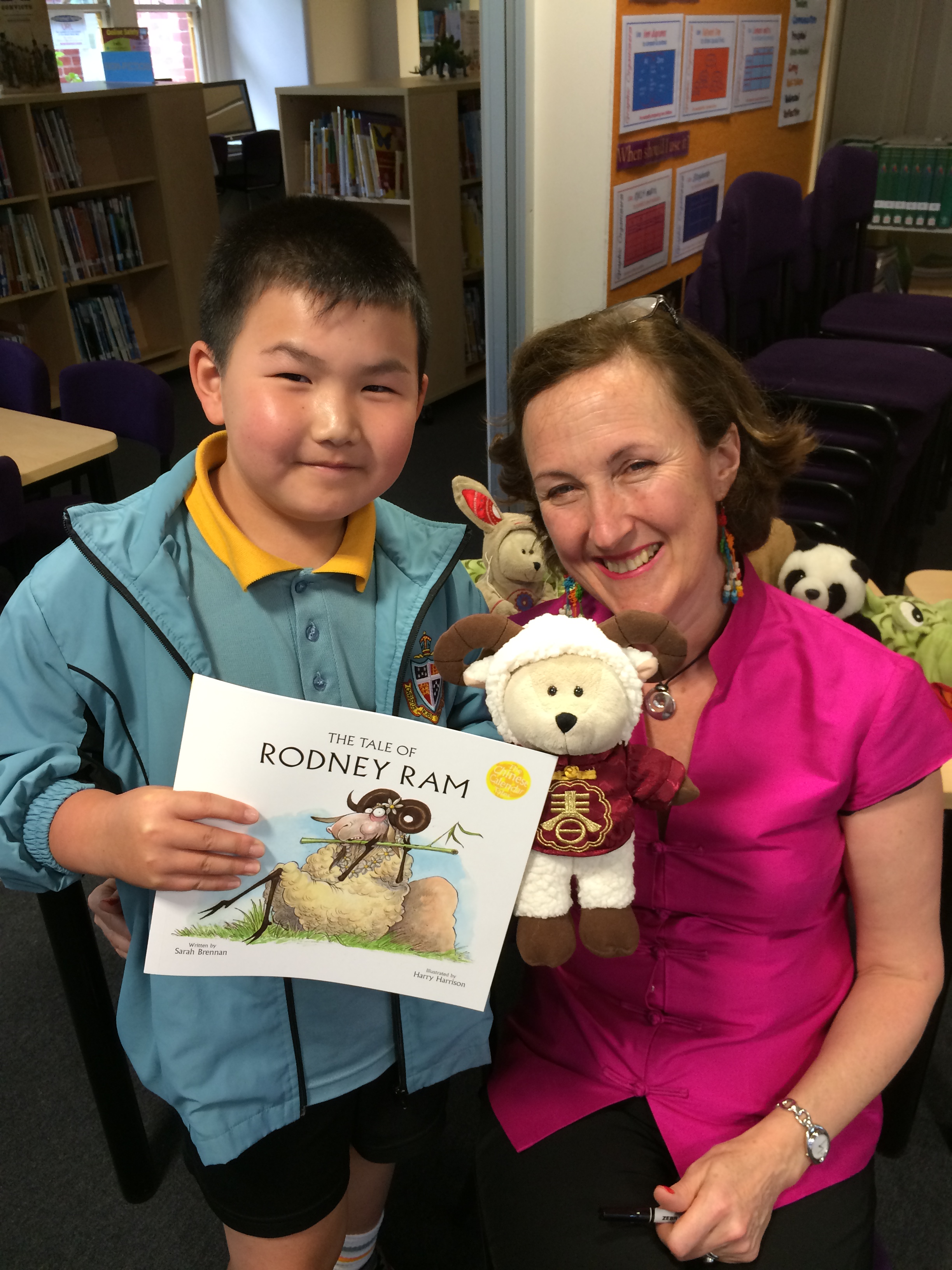 Many thanks to lovely librarian Fiona O’Rourke (right below) and assistant Lyn (left below) who hosted me to a fabulous morning today with the loveable lambs of Prep and the giddy goats of Grade 4 at Geelong Grammar Junior School! The big kids met my artistic ram Rodney, and we had a great chat about Chinese customs for Chinese New Year and how these reflect Chinese values and relationships. And the little ones met my vain Pin Yin Panda and learned all about how the animals joined the Chinese Zodiac in Lord Buddha’s Great Race! I hope you all had as much fun as I did! Here I am above with Peter, who was a great help with my Chinese pronunciation – thank you Peter!